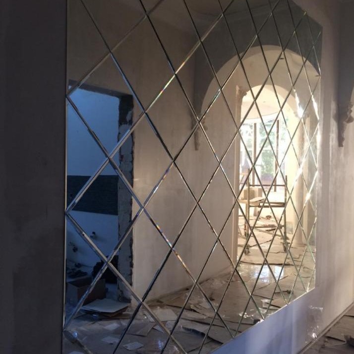 • Зеркальное панно в салоне, Москва, серебряная глянцевая плитка квадратной формы