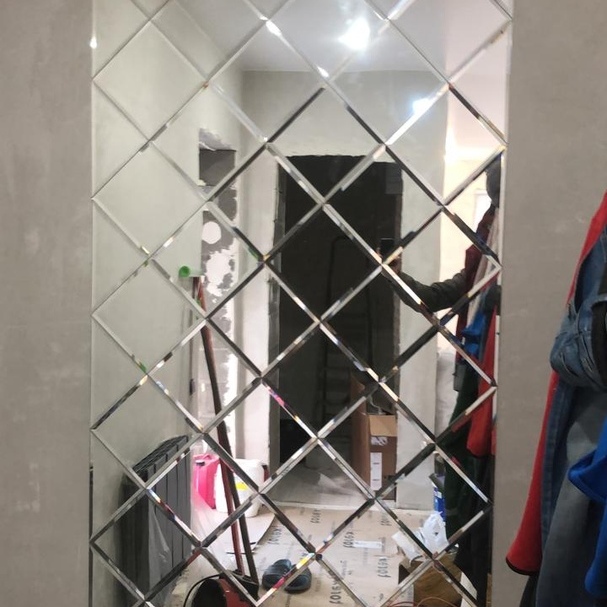 Использована серебристая квадратная зеркальная плитка размером 18х18.